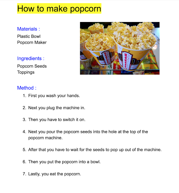 - Use verbs to describe WHAT to do eg. Stir, mix, spread